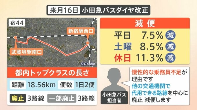 一体どうしてなのか、小田急バス担当者によりますと、「慢性的な乗務員不足が理由です。他の交通機関で代用できる路線を中心に、廃止・減便します」ということなんです。
