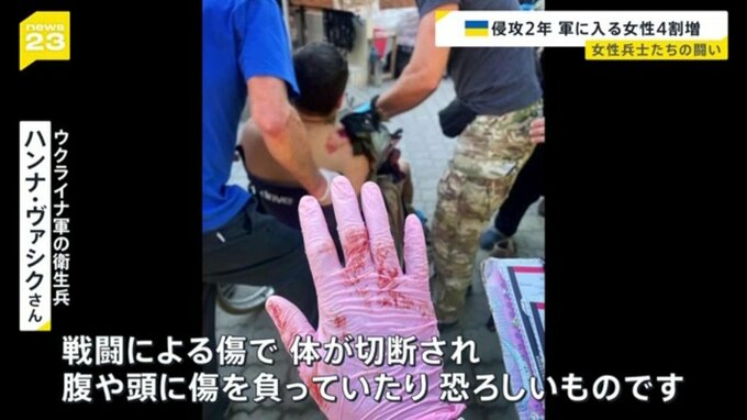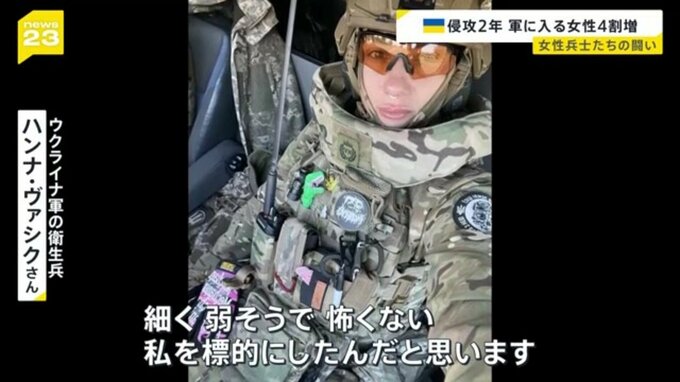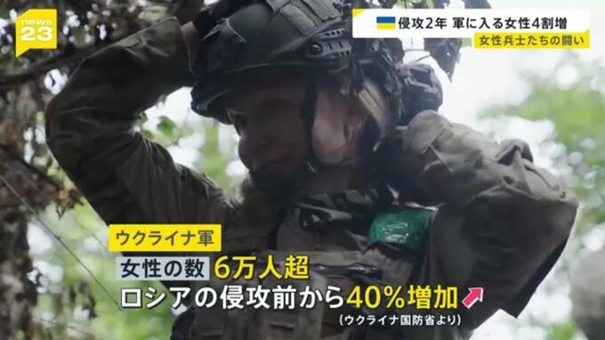 ロシアとの激しい戦闘が続くウクライナ前線で戦うのは女性たちです。ウクライナ国防省によりますと、ウクライナ軍の女性の数は現在6万人を超え、ロシアの侵攻前と比べ40%増加しました。男性に総動員令が敷かれた後も、兵力が不足しているのです。
