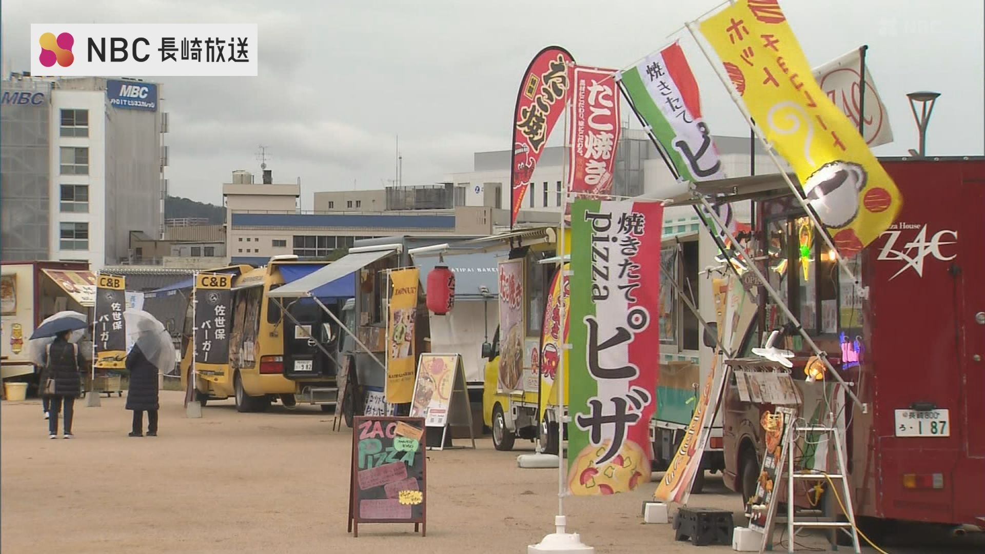 長崎市の県庁舎跡地に、県産品を使ったグルメを提供するキッチンカーや、県内7つの市と町のブースが出店し、観光客が足を運んでいました。