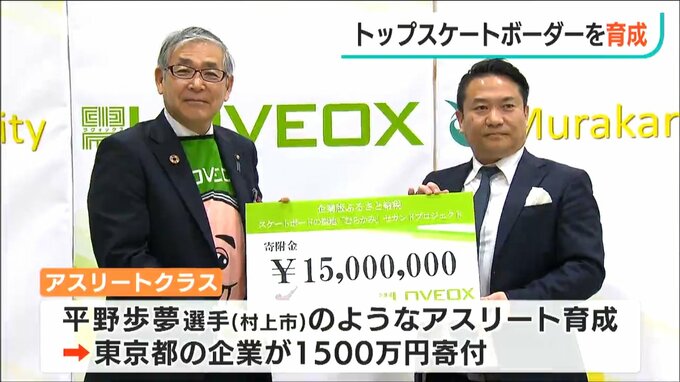 村上市スケートパークで始まったトップスケートボーダーを育成する新事業、その名も「アスリートクラス」です。村上市出身の平野歩夢選手のようなアスリートを育てたいと、東京都の企業が「企業版ふるさと納税」を活用し、1500万円を寄付して実現しました。