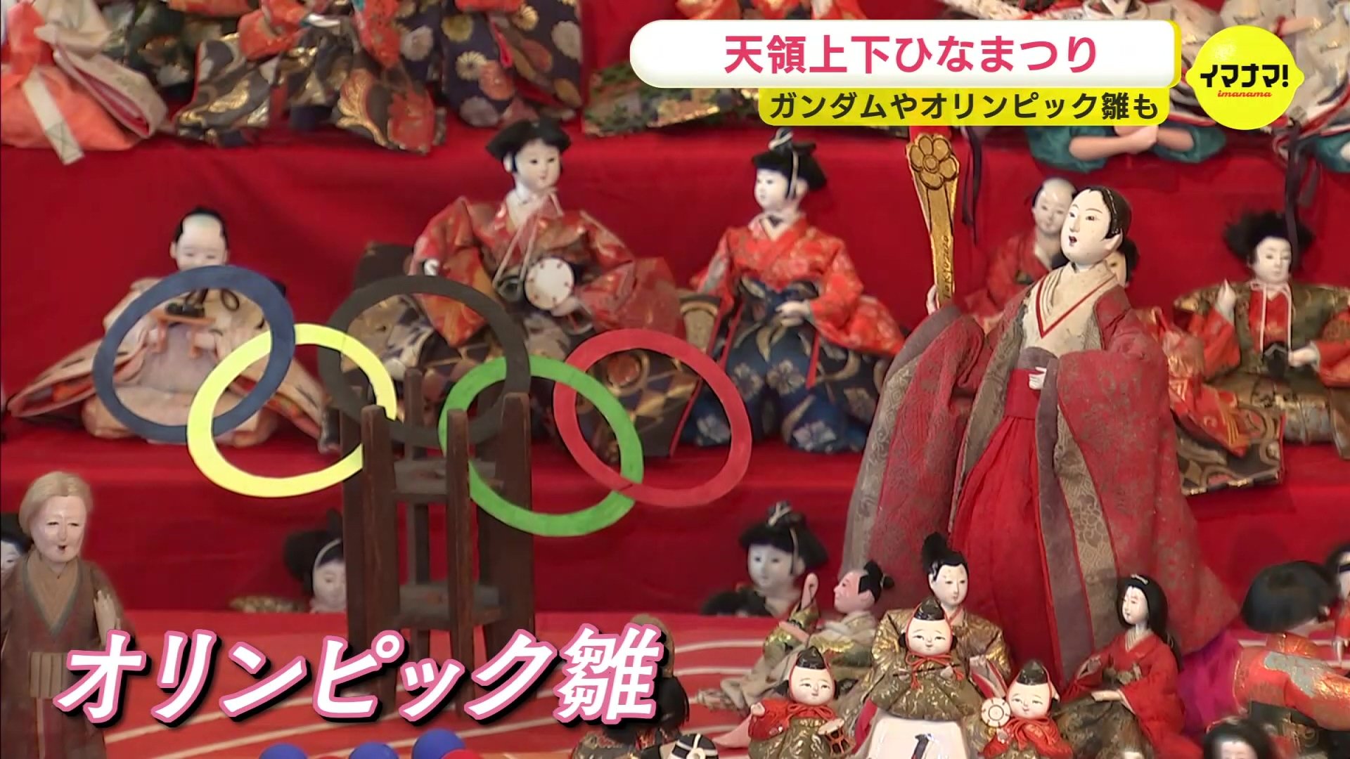 こちらはひな人形が競技をしている「オリンピック雛」です。東京オリンピックの隣りには、ことし行われるパリオリンピック。エッフェル塔やワインを散りばめ、フランスらしい作りにしたそうです。
