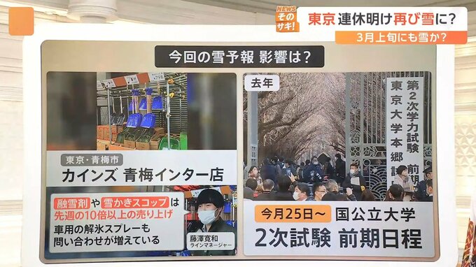 念のために備えているという方もすでにいらっしゃるようで、東京・青梅市にあるカインズでは、融雪剤や雪かきスコップは、もうすでに先週の10倍以上の売り上げだということです。車用の解氷スプレーも問い合わせが増えているということで、やはり5日の経験がありますから、皆さん備えて、備えてというなかにあるようです。