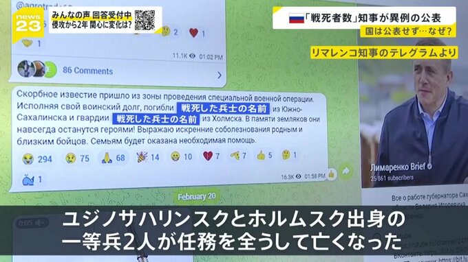 リマレンコ知事は、地元出身の兵士が亡くなるたびに、名前や階級などをSNSで公表しています。