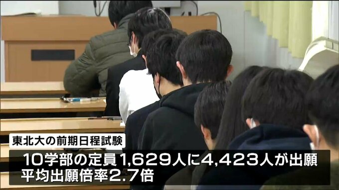 東北大学の前期日程試験には10の学部の定員1629人に対し、4423人が出願していて、平均出願倍率は2.7倍となっています。また、県内では宮城教育大学と宮城大学でも試験が行われています。国公立大学の前期日程試験はあすまでで、来月上旬に合格者が発表されます。