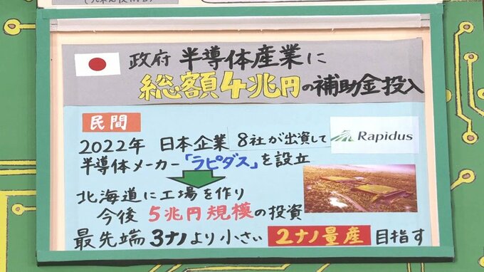 日本政府は、半導体産業に総額4兆円の補助金投入を決め、民間では、2年前に日本企業8社が出資して半導体メーカー「ラピダス」を設立。