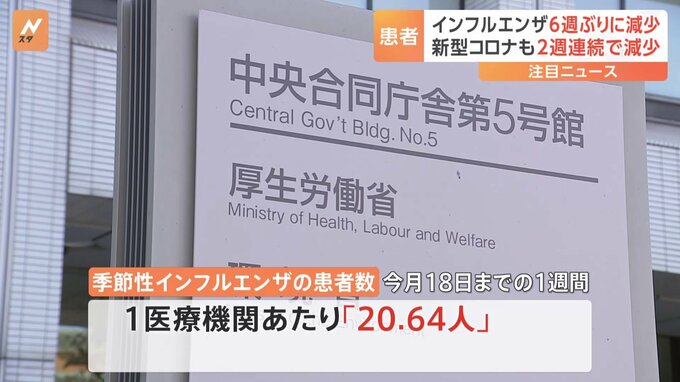 季節性インフルエンザについて、厚生労働省は全国で報告された患者の数が6週ぶりに減少したと発表しました。厚生労働省によりますと、季節性インフルエンザについて、全国およそ5000の医療機関から今月18日までの1…