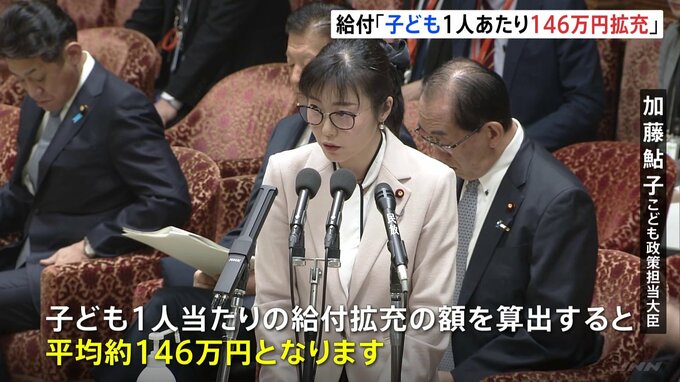 加藤こども政策担当大臣は、政府が掲げる「異次元の子ども・子育て政策」によって、「子ども1人あたりの給付額が平均およそ146万円拡充される」と明らかにしました。加藤鮎子こども政策担当大臣「児童手当や『こど…