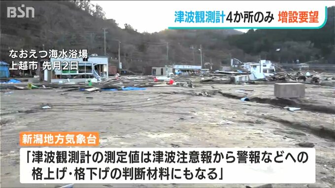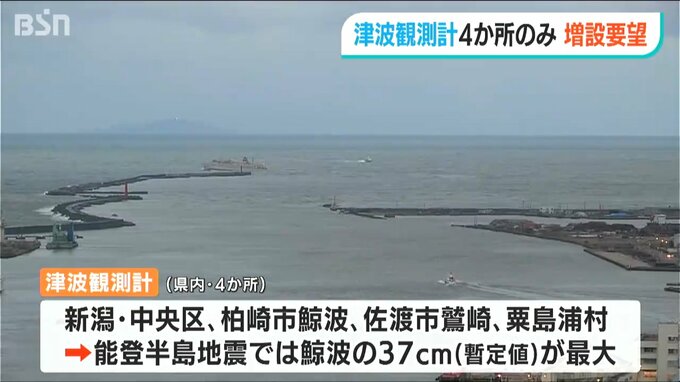 これは26日に開かれた2月県議会の一般質問に花角知事が答えたものです。県内で津波観測計が設置されているのは新潟市中央区、柏崎市 鯨波、佐渡市 鷲崎、粟島浦村の4か所だけで先月の能登半島地震で観測されたのは鯨波の37センチが最大でした。
