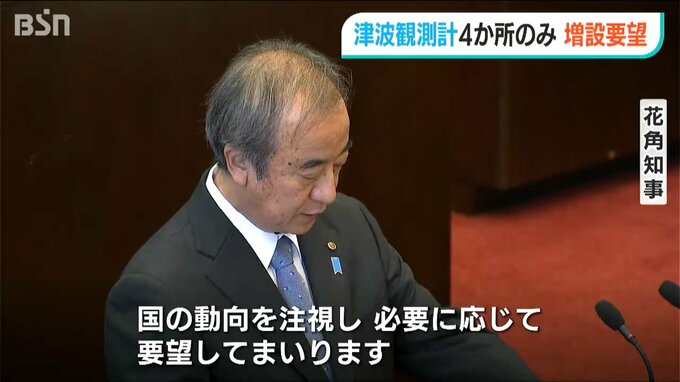 【花角知事】「津波観測系の増設は、今後の津波の検証等にも有効と考えられることから、国の動向を注視し必要に応じて要望してまいります」