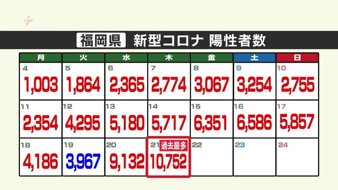 福岡県は21日、1万752人の新型コロナ陽性を発表しました。初めて1万人を超えました。発表自治体別の内訳は、福岡市が5122人、北九州市が1480人、久留米市が740人、そのほかの地域が3410…