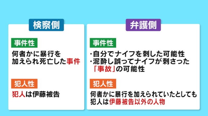 検察側は被害者が何者かに暴行を加えられ死亡した『事件』であり、その犯人は被告であると主張するとみられます。