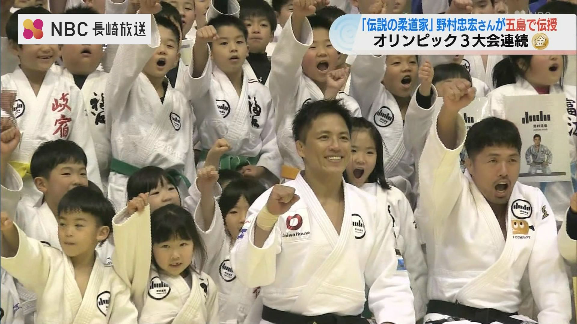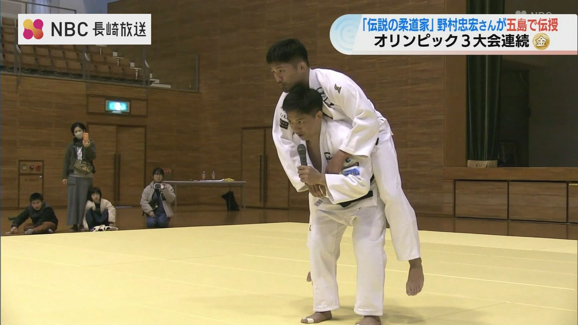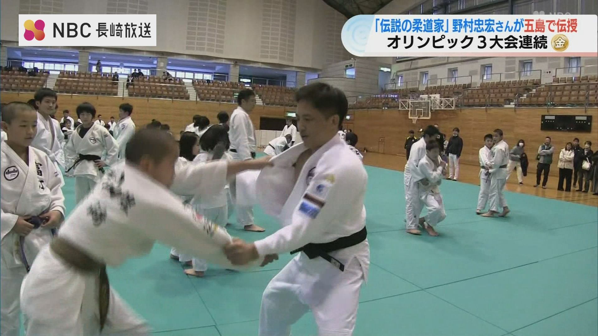 オリンピック3大会連続金メダリストの野村忠宏さんが講師となり、長崎県五島市で開かれた柔道教室には、小中学生や高校生、あわせて100人が参加しました。