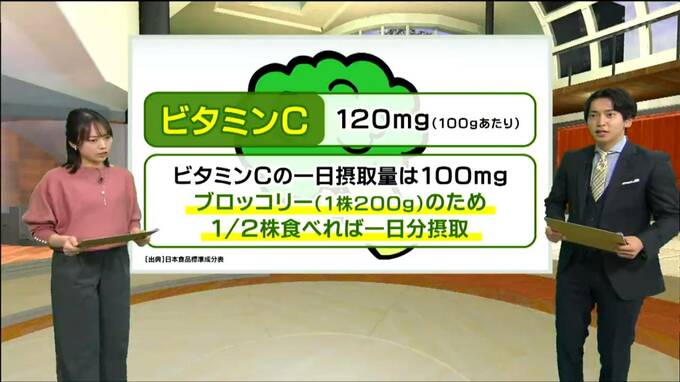 ブロッコリーが人気となっている理由は、低カロリーなうえに栄養素が豊富に含まれていることがあげられます。特にビタミンCは、100g当たり120mg含まれていてブロッコリーを2分の1株食べれば、大人が1日に必要な量を摂取できます。
