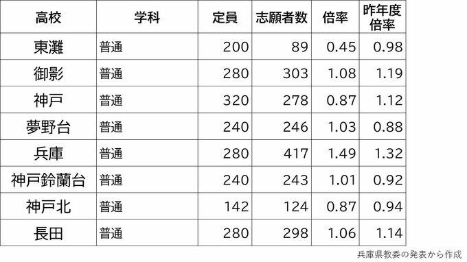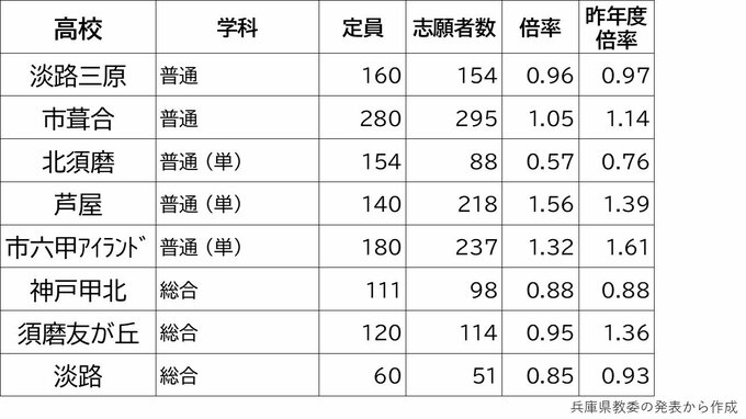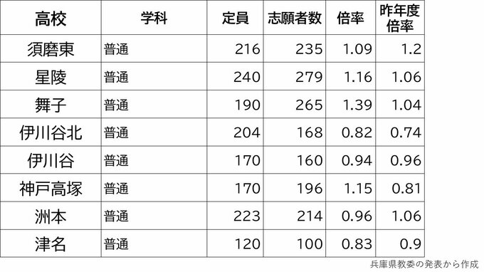 【出願締切】兵庫県公立高校入試2024 志願倍率は神戸1.17倍 芦屋1.56倍 兵庫1.49倍 加古川東1.24倍(令和6年度高校受験、全日制全校掲載) 毎日放送 2024年2月28日(水) 17:15 国内 2月26日まで 学校別の倍率一覧 神戸0.87倍 芦屋1.56倍