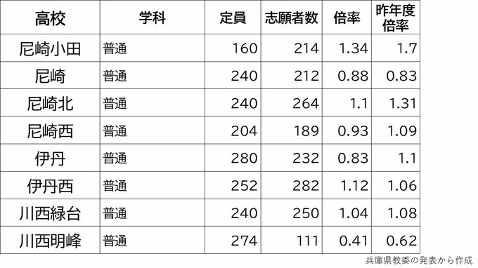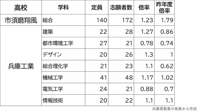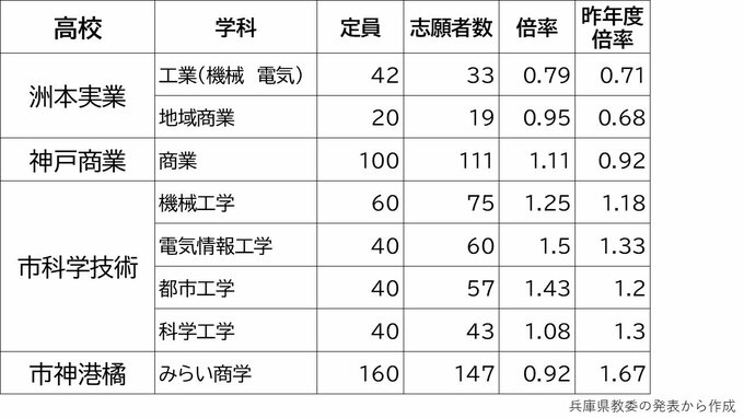 【出願締切】兵庫県公立高校入試2024 志願倍率は神戸1.17倍 芦屋1.56倍 兵庫1.49倍 加古川東1.24倍(令和6年度高校受験、全日制全校掲載) 毎日放送 2024年2月28日(水) 17:15 国内 2月26日まで 学校別の倍率一覧 須磨翔風1.23倍 尼崎小田1.34倍