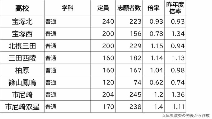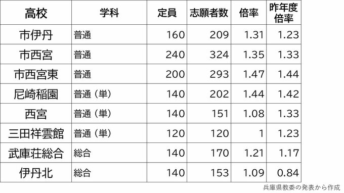 【出願締切】兵庫県公立高校入試2024 志願倍率は神戸1.17倍 芦屋1.56倍 兵庫1.49倍 加古川東1.24倍(令和6年度高校受験、全日制全校掲載) 毎日放送 2024年2月28日(水) 17:15 国内 2月26日まで 学校別の倍率一覧 市西宮1.35倍 市尼崎1.2倍