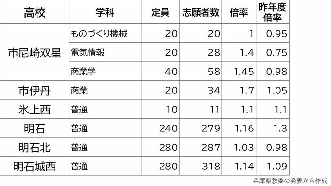 【出願締切】兵庫県公立高校入試2024 志願倍率は神戸1.17倍 芦屋1.56倍 兵庫1.49倍 加古川東1.24倍(令和6年度高校受験、全日制全校掲載) 毎日放送 2024年2月28日(水) 17:15 国内 2月26日まで 学校別の倍率一覧 市伊丹1.7倍 明石1.16倍