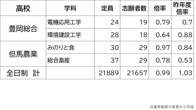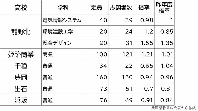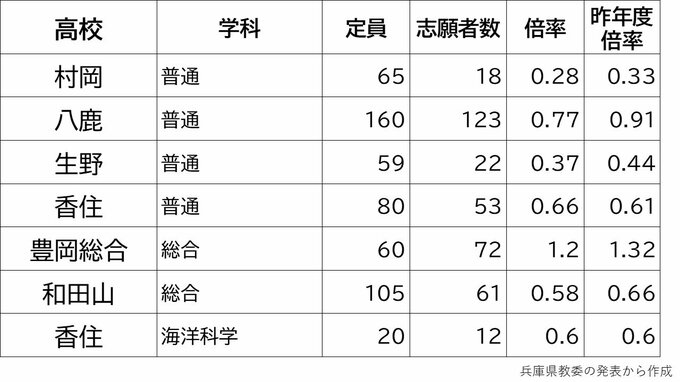 【出願締切】兵庫県公立高校入試2024 志願倍率は神戸1.17倍 芦屋1.56倍 兵庫1.49倍 加古川東1.24倍(令和6年度高校受験、全日制全校掲載) 毎日放送 2024年2月28日(水) 17:15 国内 2月26日まで 学校別の倍率一覧 豊岡0.94倍 八鹿0.77倍