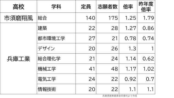 学校別の倍率一覧 須磨翔風1.25倍 尼崎小田1.39倍