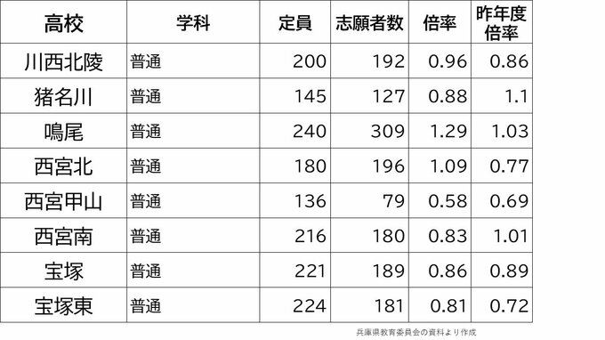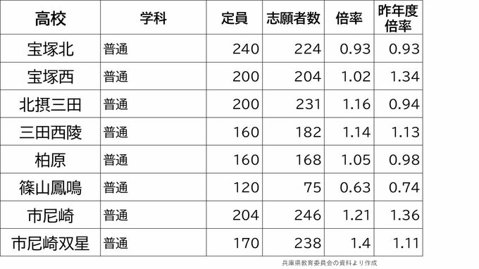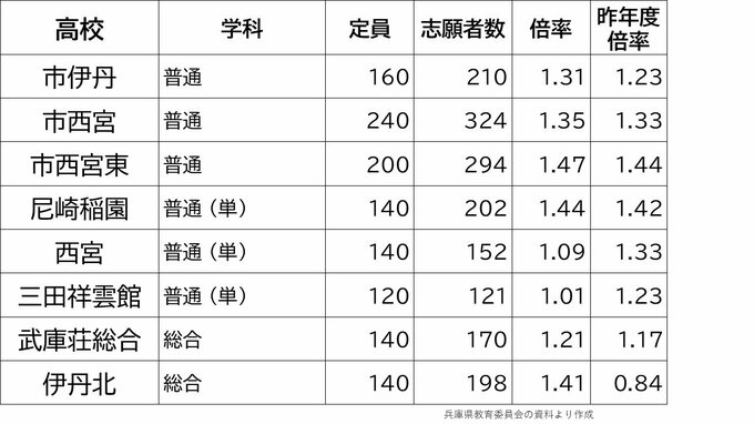 【出願締切】兵庫県公立高校入試2024 志願倍率は神戸1.17倍 芦屋1.56倍 兵庫1.49倍 加古川東1.24倍(令和6年度高校受験、全日制全校掲載) 毎日放送 2024年2月28日(水) 17:15 国内 学校別の倍率一覧 市西宮1.35倍 市尼崎1.21倍