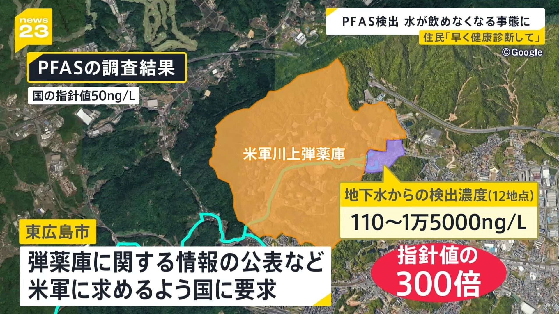 国の定めている指針値は50ng/Lですが、先週は12地点で110~1万5000ng/Lと、▼指針値の300倍の濃度が検出され、市は対応に追われました。
