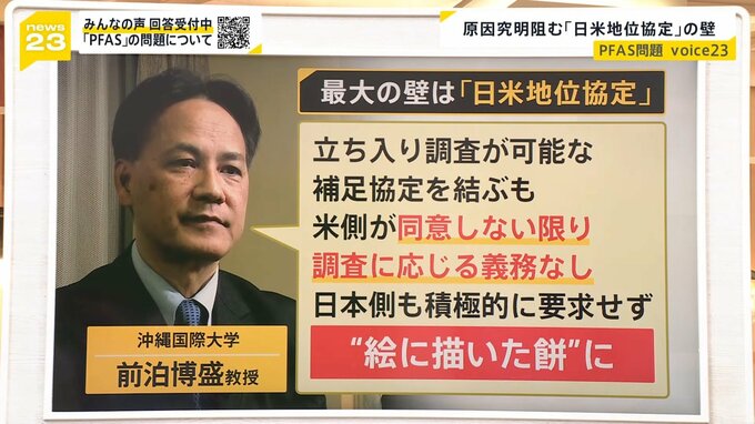 沖縄国際大学の前泊博盛教授は「立ち入り調査が可能な補足協定を結ぶも、米側が同意しない限り、調査に応じる義務なし。日本側も積極的に要求せず」だと話し、実質的には▼絵に描いた餅になっているのではないかと指摘します。