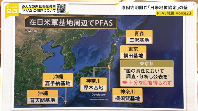 基地の中で使用された▼泡消火剤などが原因なのではないかと指摘されている中で、▼東京都は国の責任において調査・分析をして公表を、と何度も訴えているんですが、十分な回答を得られていないということなんです。