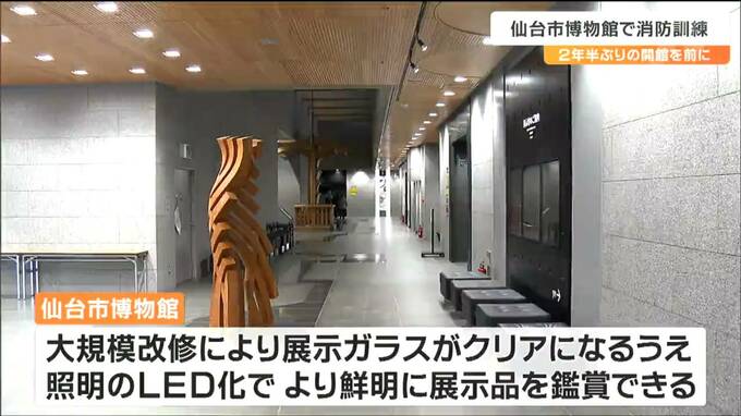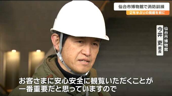 大規模改修で、今年4月から2年半ぶりに再開館する仙台市博物館で27日、消防訓練があり、初期消火から避難誘導までの手順を確認しました。