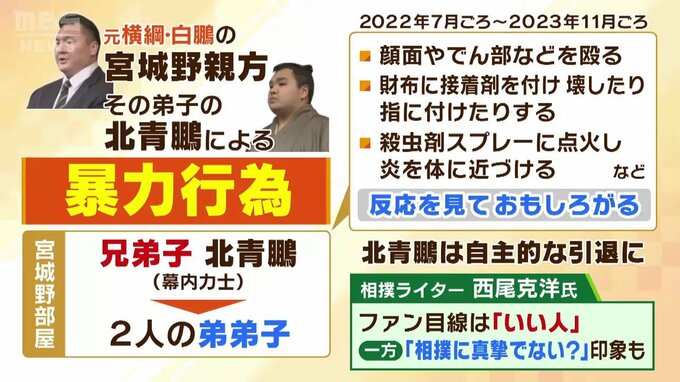 (相撲ライター 西尾克洋氏)宮城野親方の談話によると、知らなかったというふうには話してはいますけれども、これ、本当に知らなかったとしたら管理能力がないということになりますし、知っていて握りつぶしていたということであれば、それはそれで問題で、どちらにしても問題になります。