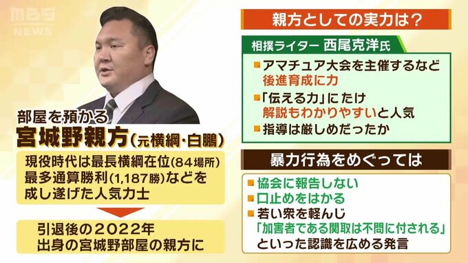 ――宮城野親方はどうなっていくのでしょうか。現役時代(元横綱・白鵬)は皆さんよくご存知で、最長横綱在位84場所、最多通算勝利1187勝などなし遂げた大横綱です。親方としての実力はどうだったのか?西尾さんによりますと「アマチュア大会を主催するなど後進育成に力を入れていた」といいます。