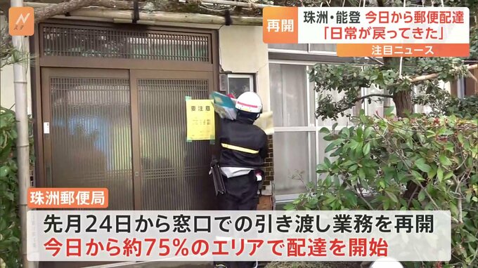 能登半島地震の影響で止まっていた各世帯への郵便物の配達。きょうから石川県珠洲市と能登町で再開しました。午前9時すぎ、配達員が郵便物を載せ、バイクで出発します。珠洲郵便局では先月24日から、窓口での郵便…