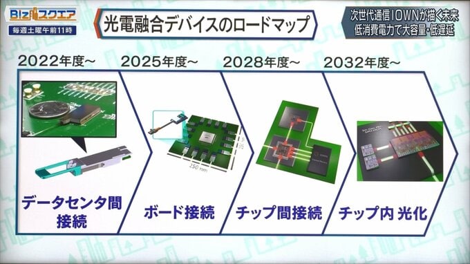 その中も光で処理をしていく世界を実現したいと思っている。チップの中にまで光を入れるとなると、やっぱり光のデバイスも小さくしなくではいけないし、さらに量産化するにはどういう形の技術が要るかというとこも含めて、このレベルまで行くのはちょっと時間がかかるかもしれないが、「データセンタ間接続」は既に実用化が進んでいて商用のサービスとして使われている。
