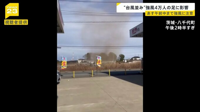 台風並みの強風は、各地で吹き荒れました。茨城県八千代町では、風の渦が発生し、農業用ビニールが飛ばされました。