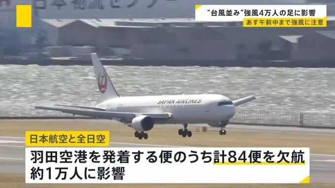 交通にも影響が出ました。日本航空と全日空は強風の影響で、羽田空港を発着する便あわせて84便を欠航し、およそ1万人に影響が出ると発表。JR東日本も、首都圏の在来線が一時運転を見合わせたことにより、あわせて約3万人に影響が出たと明らかにしました。