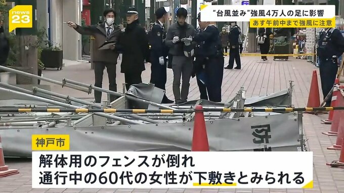 けが人も出ています。神戸市では解体用のフェンスが倒れ、通行中の60代の女性が下敷きになったとみられています。フェンスの幅はおよそ7メートル、高さおよそ8メートルで強風で倒れたとみられます。女性は、足の骨を折るなど重傷を負いました。