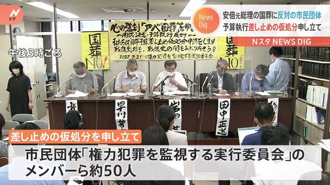 政府が秋に予定する安倍元総理の国葬に反対する市民団体が、憲法違反などを理由に国の予算執行差し止めを求める仮処分を東京地裁に申し立てました。差し止めの仮処分を申し立てをしたのは、市民団体の「権力犯罪を…