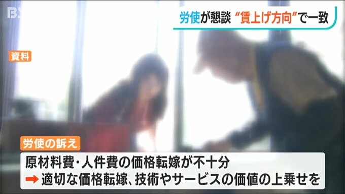 要請書には、全ての労働者の月例賃金を5%以上引き上げることや、中小企業が労務費を適切に価格に転嫁できるようにすることなど12項目が盛り込まれていて、その後、非公開で行われた協議で賃上げをする方向で一致したということです。