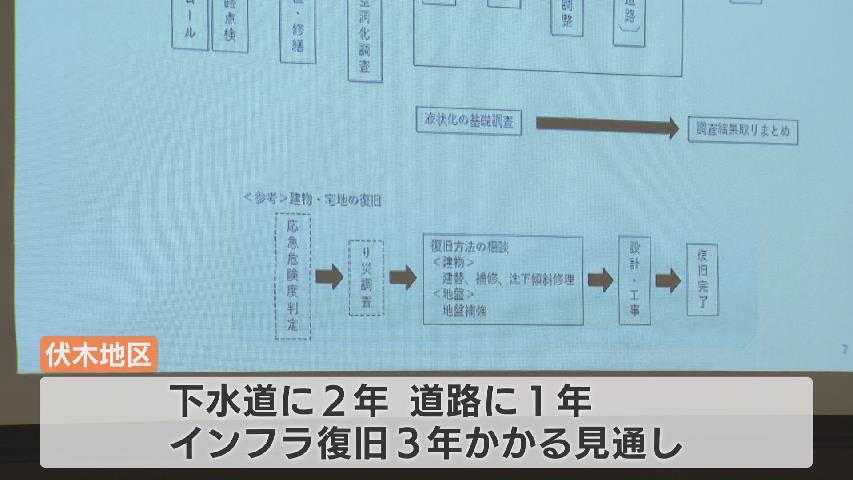 市側は、インフラ復旧のスケジュールを示し、下水道の復旧に2年、その後は道路工事に1年、合わせて3年かかる見通しであると説明しました。