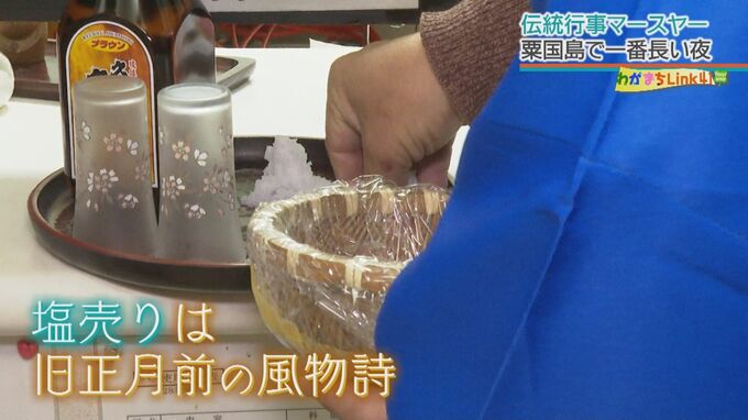 マースヤーとは、塩売りのこと。浜集落の前組(めーぐみ)では、塩売りに扮した男性が、口上を述べながら、塩を配ります。