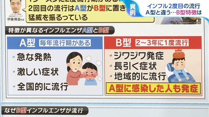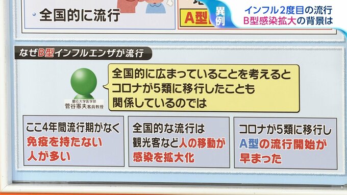 慶応大学医学部の菅谷憲夫客員教授は、「本来地域的に流行するB型が全国的に広まっていることを考えると、コロナが5類に移行したことも関係しているのでは」と話します。