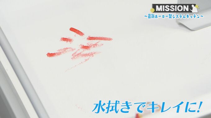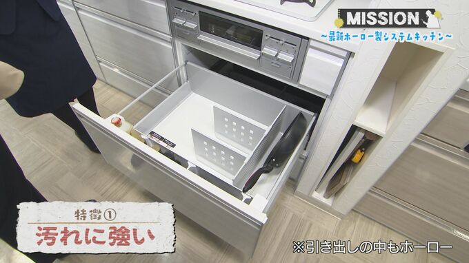 女性スタッフ「まず汚れに強いことなんです。醤油や油などを収納されると思いますが、ここ汚れますよね?」