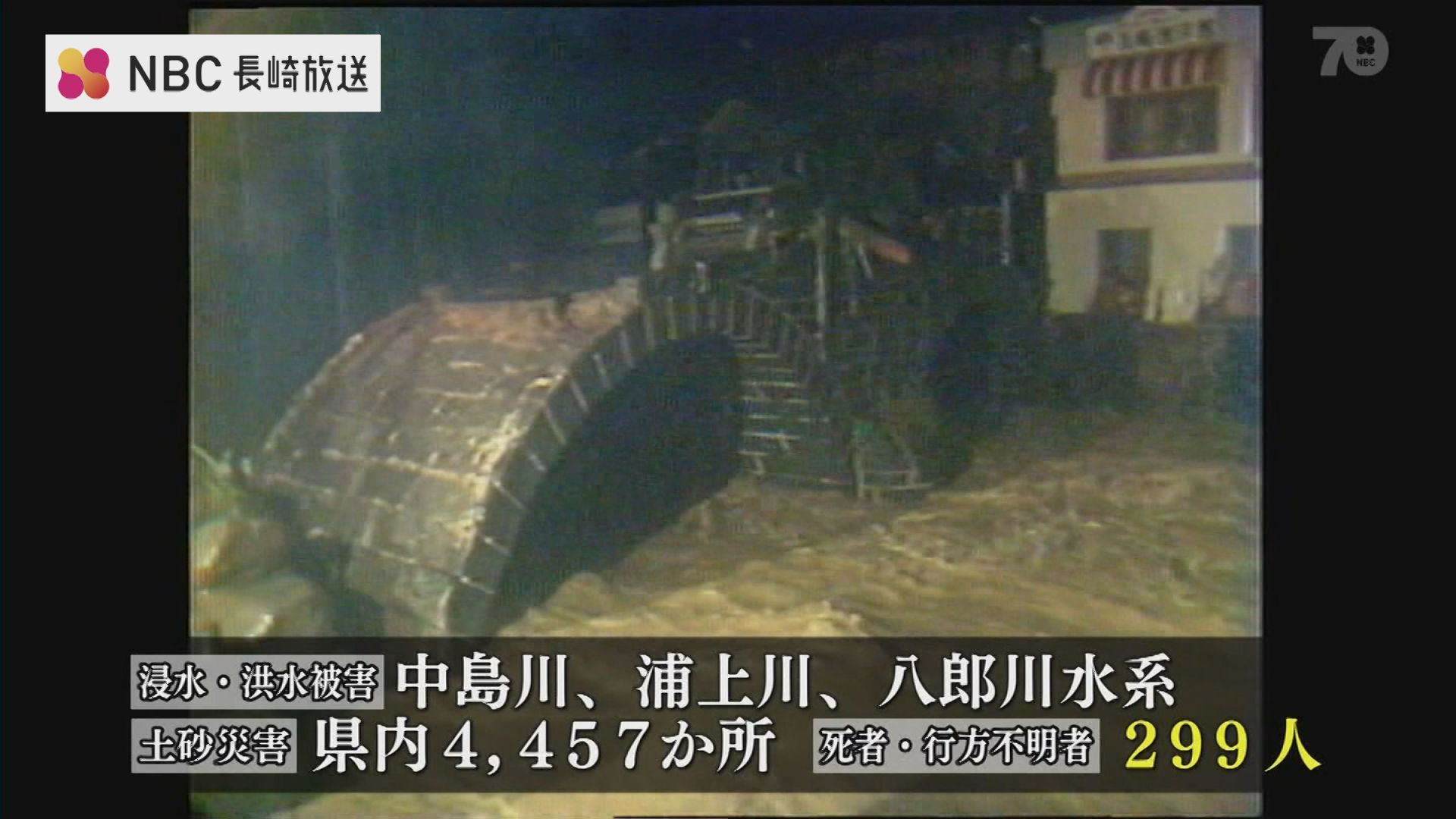 中島川など3つの水系で浸水・洪水被害が相次ぎ、土砂災害が県内4,457か所で発生。死者・行方不明者は299人にのぼりました。