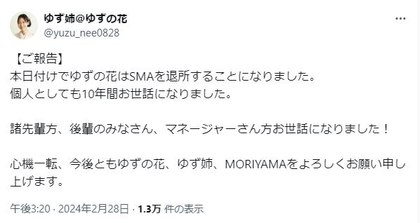 ゆず姉さんは【ご報告】と題し、「本日付けでゆずの花はSMAを退所することになりました。個人としても10年間お世話になりました。」と報告し、「諸先輩方、後輩のみなさん、マネージャーさん方お世話になりました!」と関係者に対し感謝を記しました。