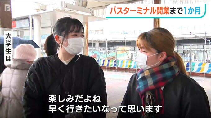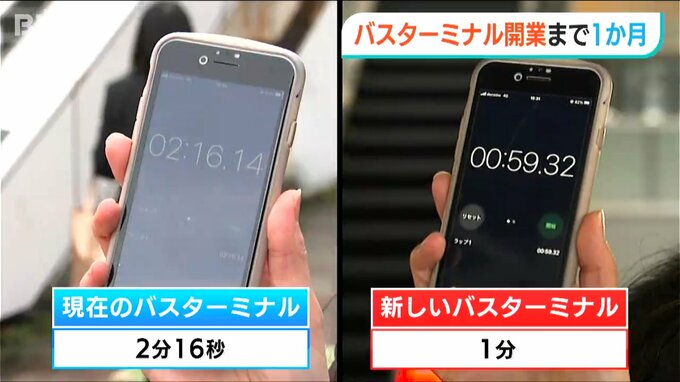 「あちら、バスの乗り場を示す表示も新しくなっています。いよいよ来月末、新しいバスターミナルの利用が始まります」