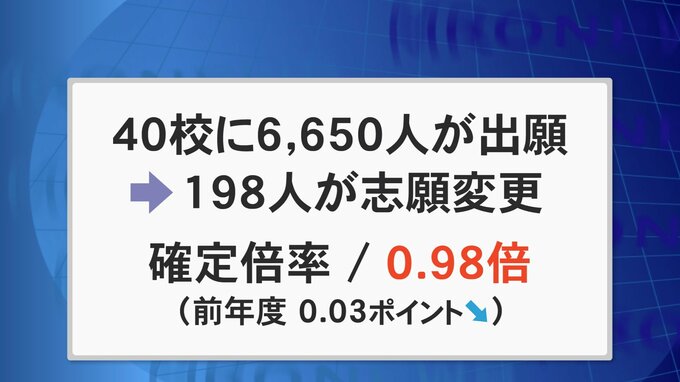 一般入試には、40校に6,650人が出願し今月26日から29日までに198人が志願変更しました。出願倍率は去年より0.03ポイント減り0.98倍となっています。