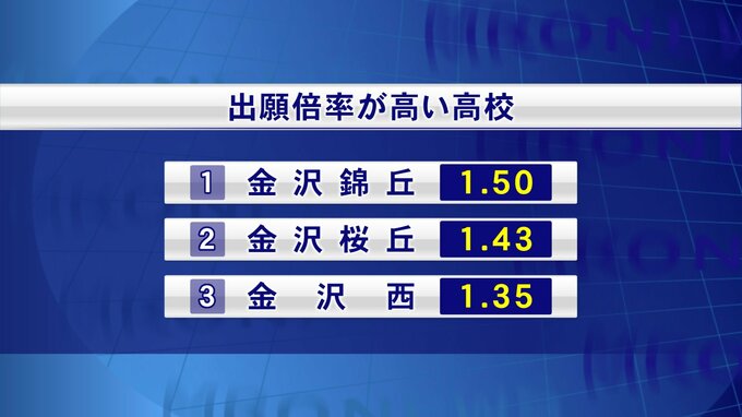 最も倍率が高い高校は金沢錦丘で1.50倍。金沢桜丘高校が1.43倍、金沢西が1.35倍です。