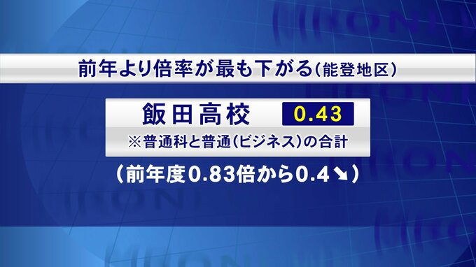 また能登地区の高校で、前の年より倍率が最も下がったのは珠洲市の飯田高校で前年度の0.83倍から0.43倍となっています。
