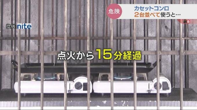 カセットコンロを2つ並べて使用した映像です。点火から15分が経過すると─。