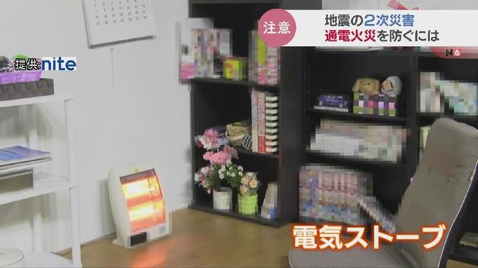 地震の揺れにより、電気ストーブの上に可燃物が落下したまま、停電が発生。ブレーカーを落とさずに避難した際、停電から復旧すると、再び電気ストーブに通電し、火災となるのです。