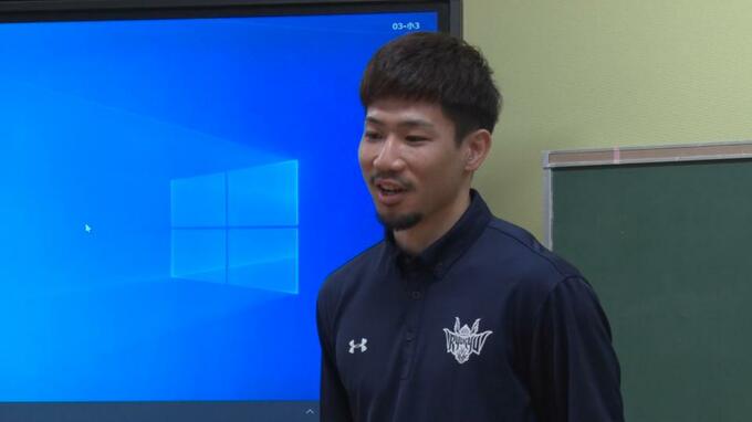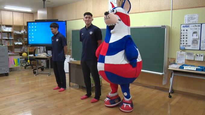 市内の島袋小学校には29日、岸本隆一選手と植松義也選手が訪れ、贈呈式が行われました。